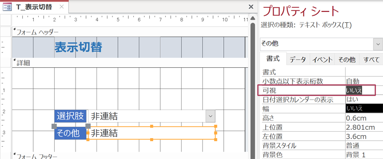 デザインビューでプロパティシートの「書式」タブから「可視」を「いいえ」に変更することで、コントロールを非表示にすることができます。これは、フォーム上の特定のコントロールを常時非表示にする場合に便利です。また、条件に応じてコントロールの表示・非表示を切り替える必要がある場合は、VBAを使用することで実現可能です。