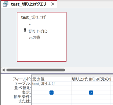 この処理では、整数であれば元の値のまま、小数点以下の値があればInt関数で切り上げた値に+1して切り上げ処理を行います。この方法は、ACCESSのクエリビルダーで使用する場合に便利です。