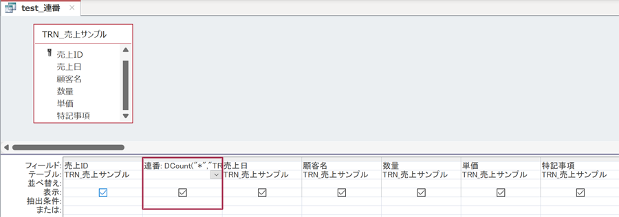 ただし、クエリで連番を作成する場合には、DCount関数を使用する必要があります。DCount関数は、指定された条件に合致するレコードの数を返す関数です。連番を作成する場合には、対象のテーブルに対し、各レコードの主キーの値以下のレコード数を調べる必要があります。たとえば、売上IDが主キーであるテーブルの場合、以下の式を使用することができます。連番: DCount(*,TRN_売上サンプル,売上ID <= & [売上ID])