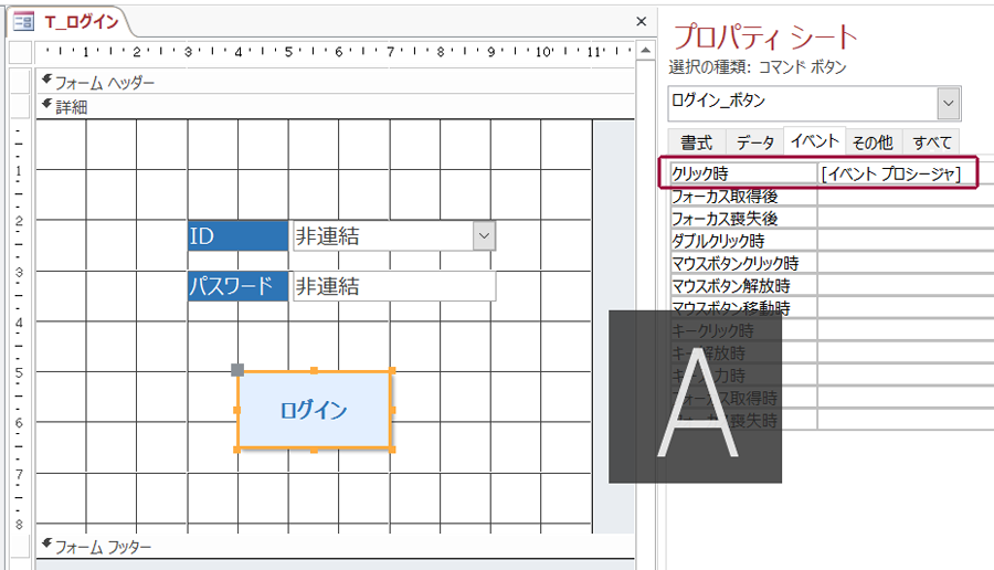 ログインボタンクリック時イベントを設定するには、フォーム上のボタンを右クリックし、プロパティシートを表示します。プロパティシートのイベントタブで、クリックイベントを探し、コードビルダーをクリックしてコードエディターを開きます。コードエディターでは、クリックイベントのコードを記述し、VBAコードを実行する必要があります。
