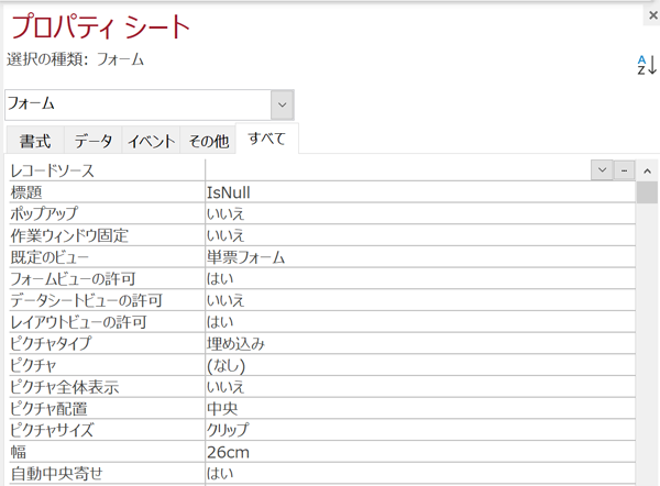 ACCESS プロパティシートは、フォームやレポートの詳細設定を行うための設定画面です。プロパティシートを使用することで、フォームやレポートのデザインビューに表示され、書式、データ、イベント、などの設定項目が配置されています。