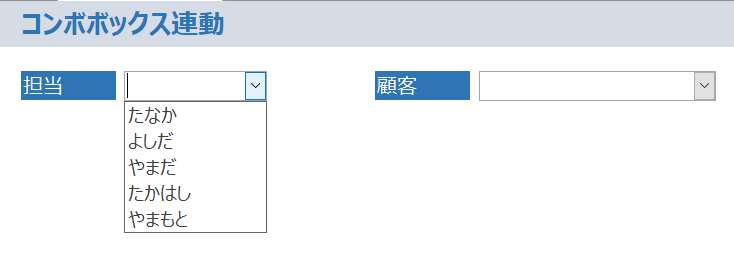 ACCESS のフォームで コンボボックス を使用する際、1つのコンボボックスの選択によって別のコンボボックスの選択肢を変えるというシナリオはよくあります。たとえば、担当者を選択すると、その担当者が担当する顧客のみがコンボボックスに表示されるように設定したいという場合です。このような 連動 を実現するには、 VBAプログラミング を使用する必要があります。