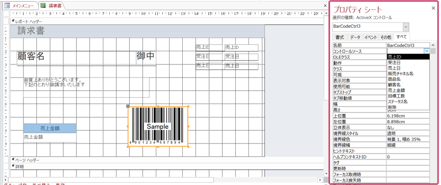 レポートにActiveX コントロールを追加した後は、バーコードに必要なデータを選択し、コントロールソースに設定する必要があります。コントロールソースは、バーコードに表示されるデータを設定するためのフィールドです。このフィールドにデータを設定することで、バーコードに必要な情報を表示することができます。