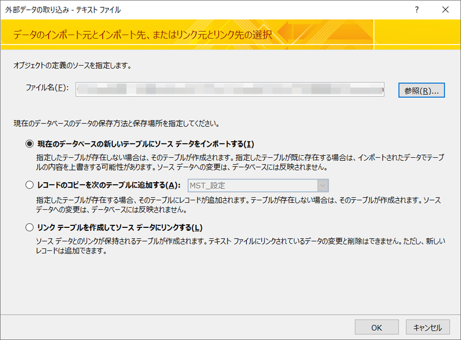 インポート処理では、保存方法を選択する必要があります。 新規テーブルへのインポート、既存テーブルへのインポート、リンクテーブル作成の3種類の保存方法があります。 保存方法を選択したら、データの区切り方や区切り記号を設定する必要があります。