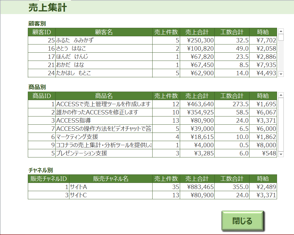 一方、ACCESSでは、集計フォームを作成することで、ボタン一つで最新のデータを集計することが可能です。ACCESSの集計クエリ機能を使用することで、テーブルの中でどれだけレコードが増えても常に最新の集計結果を表示することができます。これにより、データの管理と集計が簡単になり、ビジネス上の意思決定を効率的に行うことができます。